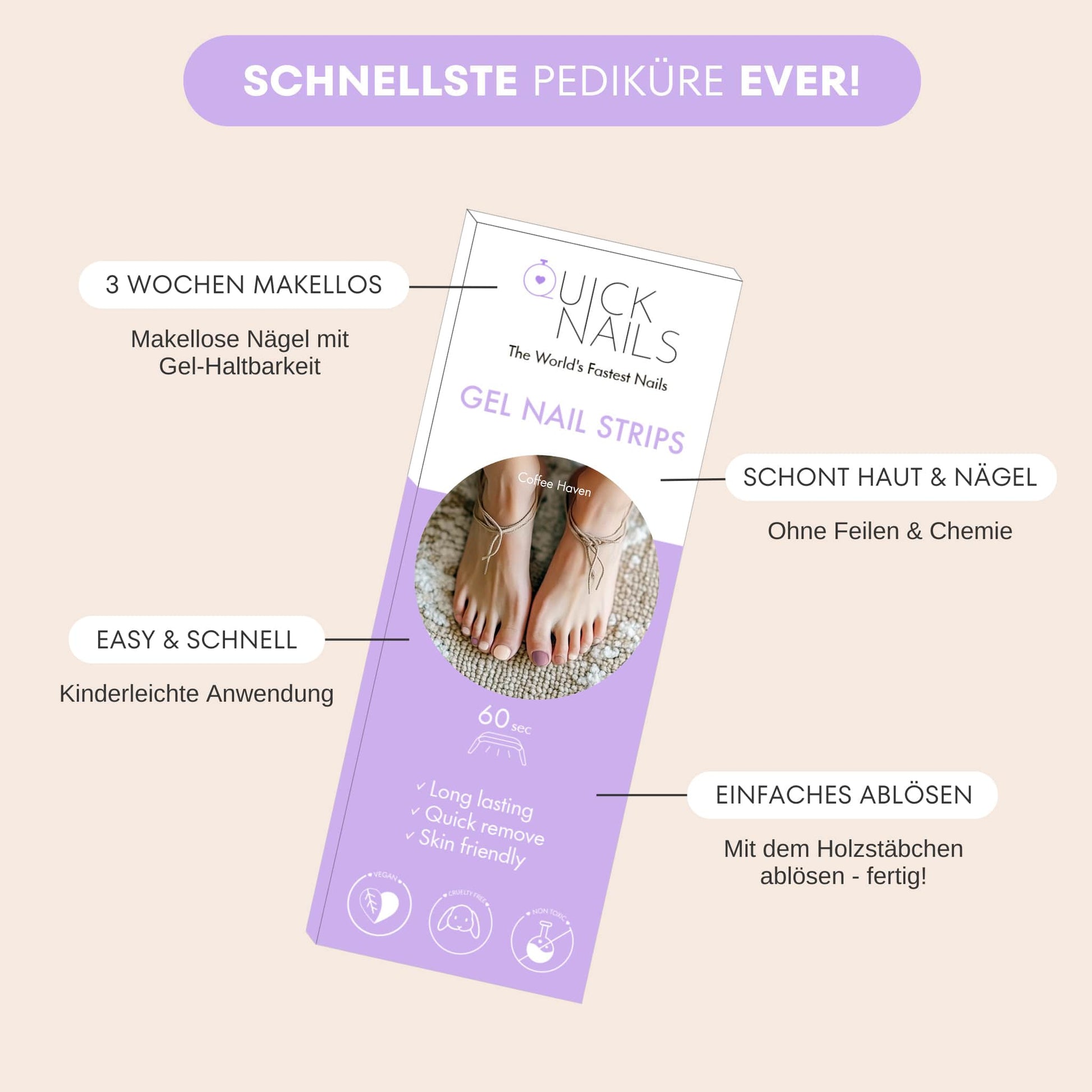 Keine Zeit für einen langen Termin? Kein Problem! Mit Quicknails für die Füße bekommst du in wenigen Minuten eine professionelle Pediküre – ganz ohne Aufwand. Einfach aufkleben, andrücken, aushärten – fertig ist dein cleaner, gepflegter Fußlook! In jeder Packung findest du 32 Gel Strips in verschiedenen Größen, damit wirklich jeder Zeh perfekt versorgt ist.